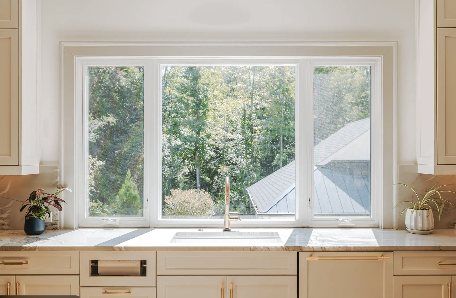 مطبخ بموقد تحت شفاط أمام نافذة كبيرة—التهوية المتقاطعة تقلل الروائح والحرارة بسرعة